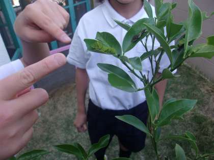 学校のみかんの木にアゲハのあおむしがたくさんいます!