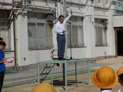 今日の児童朝会では「あいさつ週間」と「いかのおすし」のお話がありました。