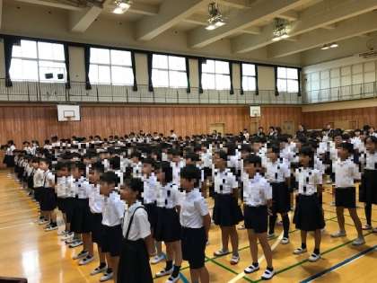 終業式では、大阪市歌、校歌を歌う子ども達の声が響いていました。