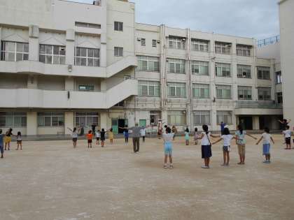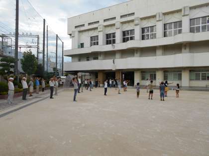 夏休みに入って、毎朝新庄小学校の校庭ではラジオ体操が行われています。