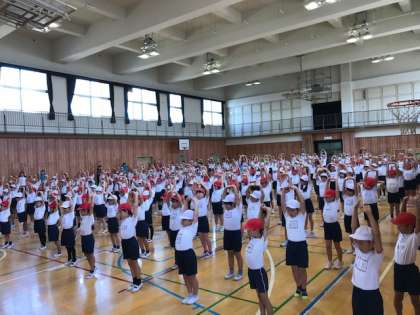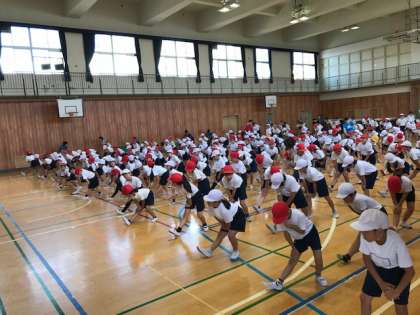 今日は臨時で集会を行い、「新庄っ子体操ストレッチバージョン」を練習しました。