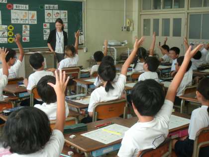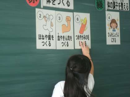 食べ物を「黄(エネルギーのもとになる)」「赤(体をつくる)」「緑(体の調子を整える)」の3つのグループに分けるクイズをしながら、食べ物の働きを知りました。