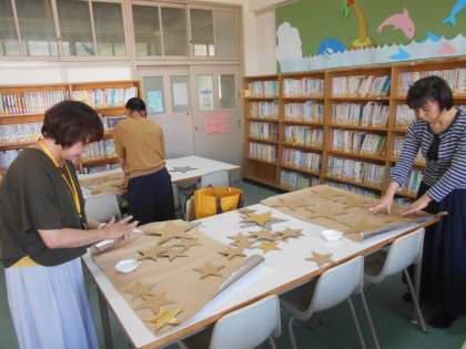 新庄小学校の図書ボランティア「コロボックル」の皆さんが、プラネタリウムの飾りつけを作っておられます。