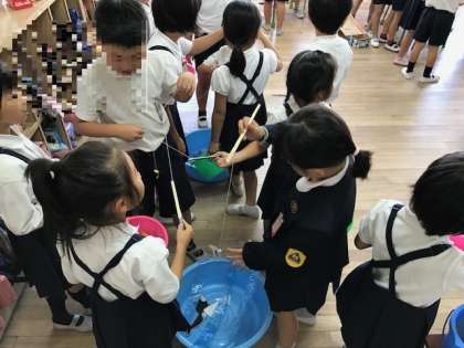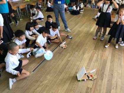 2年生が作ったおもちゃで1年生と一緒に楽しく遊ぶ様子はとてもほのぼのとしていました。