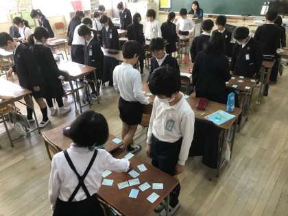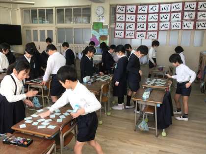 子ども達は休憩時間にも覚えようと、一生懸命カルタと向き合っていました。