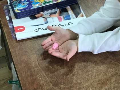 赤ちゃんのハムスターを実感するために、生まれたてのハムスターと同じ大きさで同じ重さの模型を子ども達に触らせました。子ども達はとっても大切そうに両手にのせている様子がほほえましかったです。
