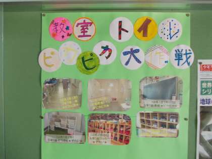 12月1日(月)から5日(金)まで、「教室ぴかぴか大作戦」の期間を設けています。昼のお掃除をていねいにして教室の床や机の上をぴかぴかにすることはもちろんですが、上靴やランドセルをきれいに並べて雰囲気もぴかぴかにすることを目標としています。教室が落ち着いて学習に取り組める環境にするよう努めています。