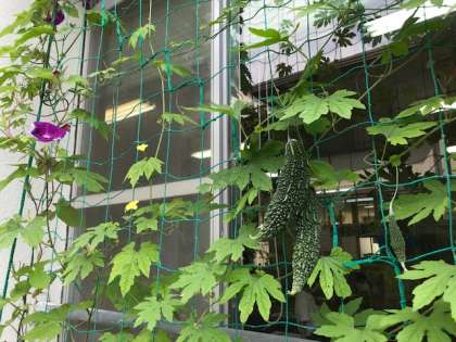 1年生の教室の外で栽培している、日よけのゴーヤもずいぶん大きくなりました。