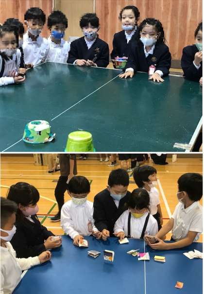 2年生は「おもちゃランド」に1年生を招待するため、何週間もわたって、おもちゃを作ったり、掲示物を作ったり、遊び方の説明を考えたり頑張ってきました。
