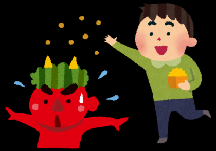 鬼は病や災いを表します。昔、京都の山に鬼が出た時、大豆を鬼の目に投げつけて退治したと言う伝えがあります。「魔目」に豆をぶつけて鬼を滅亡させることから「魔滅まき」に通じるとの説も。だじゃれのようですが、人気まんが「鬼滅の刃」の「鬼滅」に似ています。