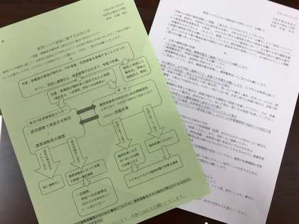 また、「新型コロナ感染に関するお知らせ」には、児童・教職員の感染が疑われ、PCR検査・抗原検査を受験することになった場合について、フローチャートで示したものです。