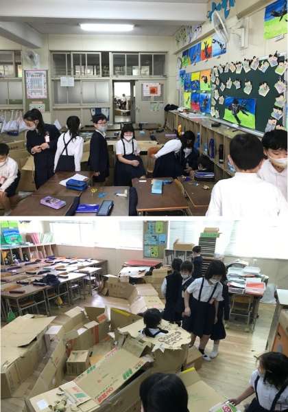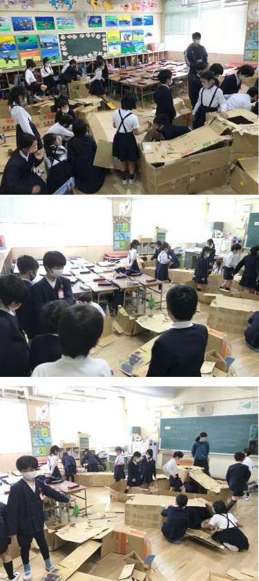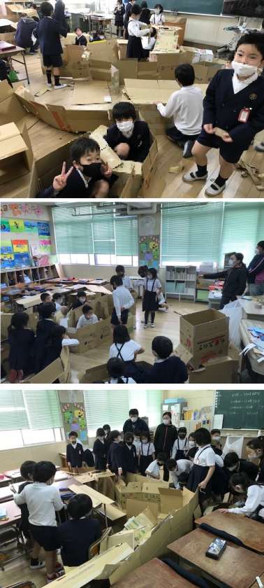 段ボールは学校でも家庭でもよく目にするもので、子どもたちにとっては身近なものです。しかし、今回は普段と違う使い方で、楽しんで活動し、素材の特徴を生かしながら創意工夫し、思い思いの作品を作りました。