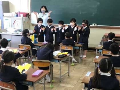 写真は、1年生国語科「とん とん とととん はじまるよ」の授業の様子です。