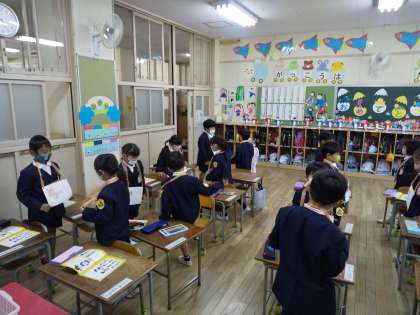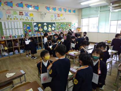 国語科で「よろしくね」の学習をしました。大きなカードに、自分の名前と好きなもの(食べ物や動物など)をかいて、互いに自己紹介しました。どんどん友達の輪を広げていってほしいです。
