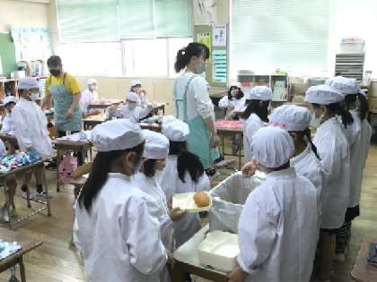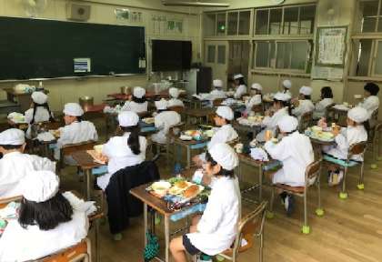 給食に使われているミックスフルーツの缶詰は、国内産の黄桃、パインアップル、和なし、みかんが入っています。