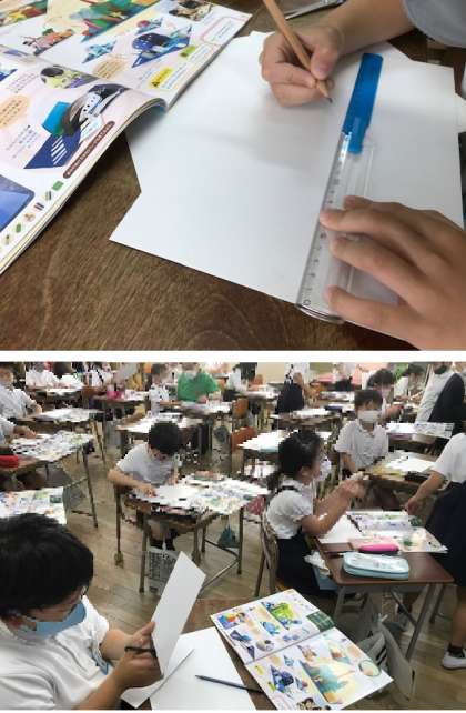 紙を重ねて、わりピンでとめると、少しずつ作ったものが回ります。