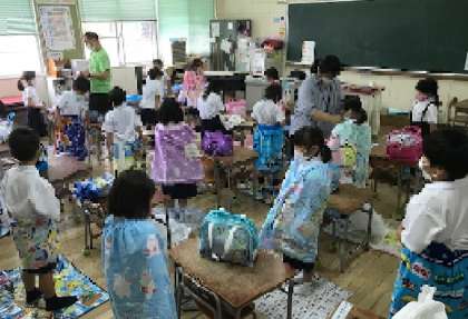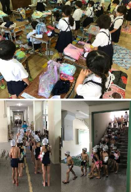 今日は、プール開きに先立って、プールに入るまでの手順を両方のクラスで学習しました。新庄小学校のプールは1年生の教室の上、屋上にあります。
