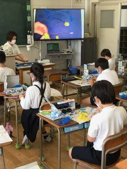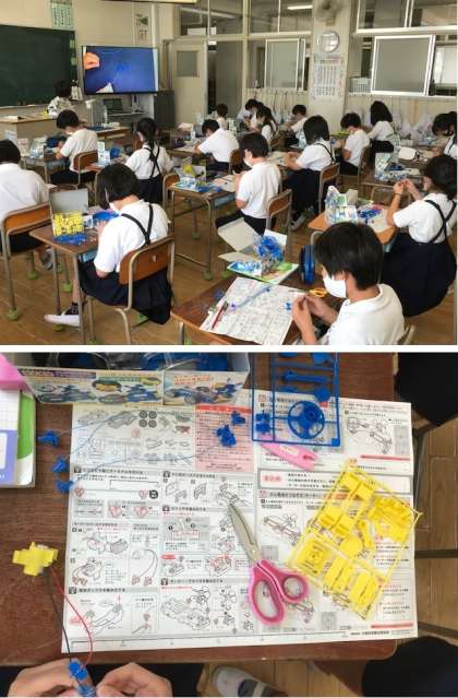 子どもたちは、モーターカーを作りながら乾電池の働きや、モーターが回る速さについて学習を深めていきます。
