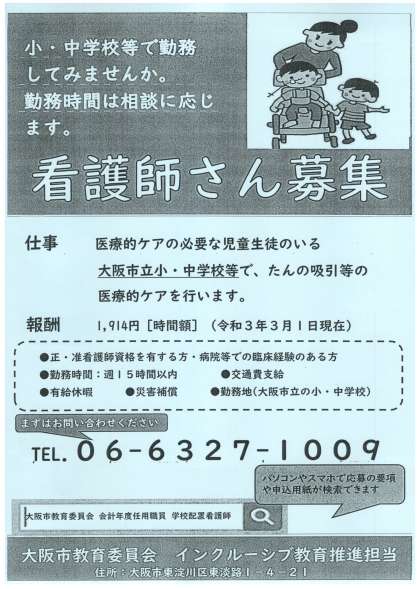 お仕事の内容は、大阪市立小・中学校等で、医療的ケアを行っていただきます。