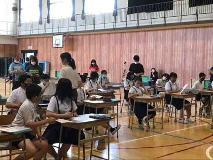 今年度の本校の研究は、昨年度までの国語科の書く活動に加えて、発展的な学習に国際理解教育を取り入れています。