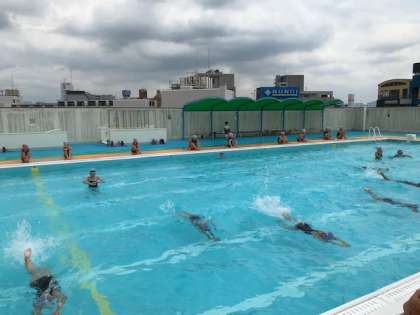 バタ足キック、クロールの腕のかき等、グループに分かれて取り組んでいます。