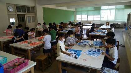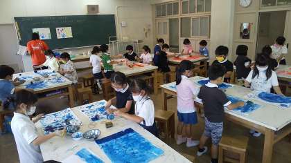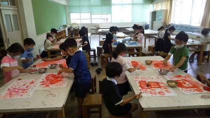 道具や手に絵の具をつけてぺったん。ローラーを使ってころころ。とても楽しく学習できました。後片付けも協力してできました。