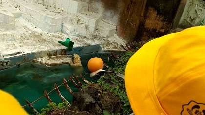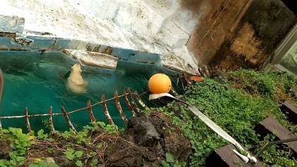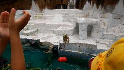 シロクマの子どもホウちゃんが、みんなの拍手にこたえて陸に上がって、こちらを見てくれました。