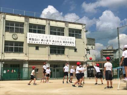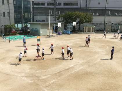 運動場では、4年生が体育の時間ポートボールに取り組んでいました。