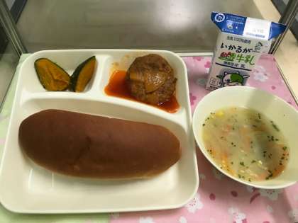 ・煮込みハンバーグ・コーンとキャベツのスープ・焼きカボチャ です。