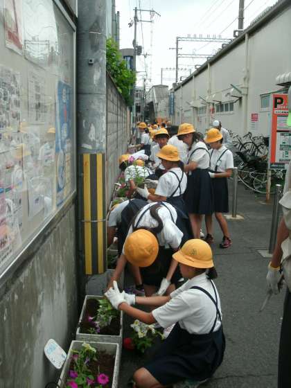 6月22日(月)1限目、6年生が学校周辺にあるプランターの花を植替えました。地域やPTAの方々もたくさん応援に来ていただき、手際よく終了しました。