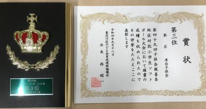 1つ目が、「新庄連合子供会」の親善各地区対抗小学生ソフトボール大会での3位の表彰です。おめでとうございます。
