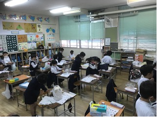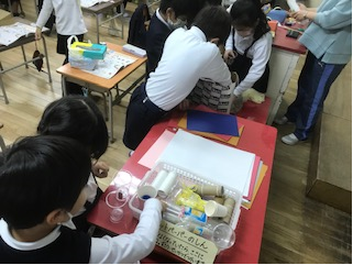 1年生の教室から、シャカシャカと、楽しい音が聞こえてきます。