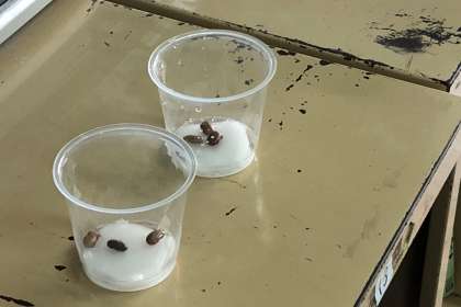 種子の発芽の条件を調べるため、水分を含んだ容器と水分がない容器それぞれに種子を入れて、月曜日に再度観察をします。