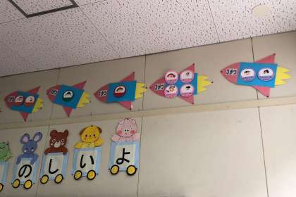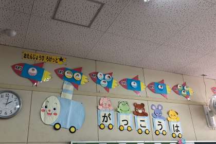 1組・2組の上空には、お誕生日ロケットが飛んでいます。お誕生日を迎える子どもたちに、先生からお祝いカードをいただきました。