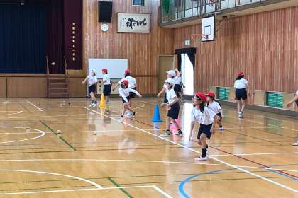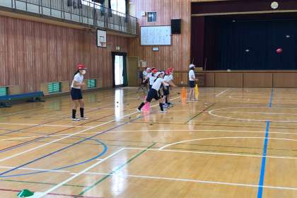 体力テストのソフトボール投げの練習で、紙を丸めて作ったボールで練習しました。