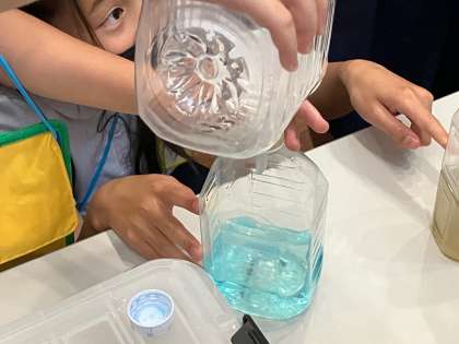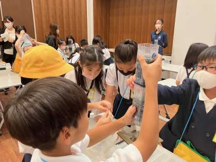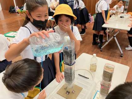 淀川の水をろ過していく実験をしました。子どもたちは、とても興味深げに実験をしていました。