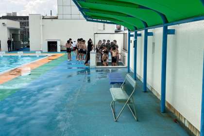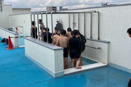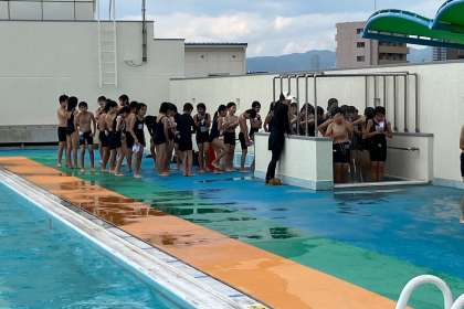本日が、プール水泳の初日です。入水前と後のシャワーは、まだまだ冷たいようです。