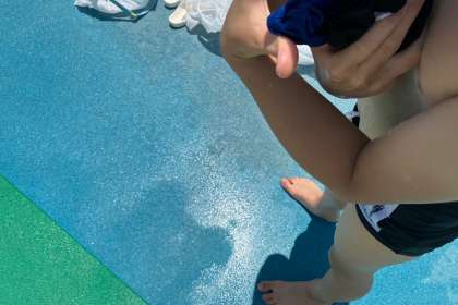 着衣泳を体験しました。終わったあと、着ていた服を絞ると、水がボタボタとおちました。ら