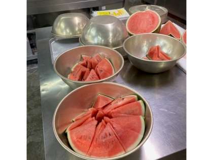 本日の給食のメニューに、夏を感じる代表的な野菜であるスイカが出ました。給食調理員さんができるだけ当分になるよう、カットしてくださいました。