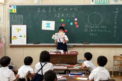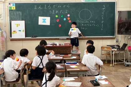 画用紙に貼った丸いものは、何を表しているかを考えました。
