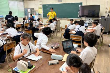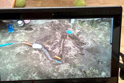 流れる水の働きを調べるために、学習園で実験する様子を動画に撮って、確認をしました。