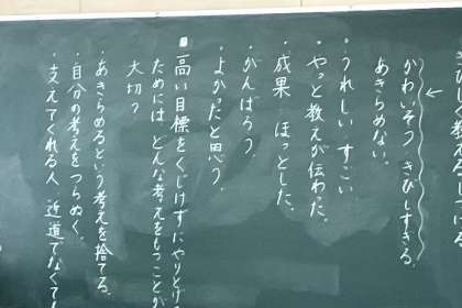 くじけずに物事をやり抜くには、どんな考えをもつことが大切かを考え、意見交流をしました。
