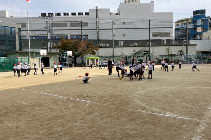 ボールを転がす練習をした後、円の中にいる子どもたちに、ボールを転がせてあてるゲームをしました。