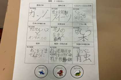 読書週間に読んだ本についてできたビンゴによって、しおりをもらうことができます。今日から3日間、ビンゴの数によってしおりと交換してもらえます。