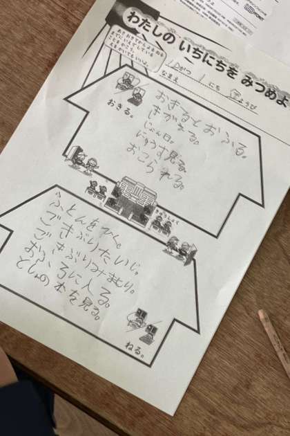 自分が起きてから寝るまでの間、何をしているかを書き出しました。宿題として、家族の一日についても書いてくることになっています。