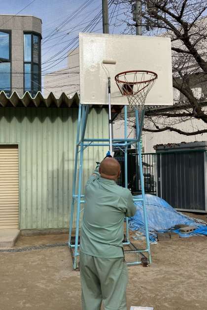 管理作業員さんが、色褪せていたバスケットボール用ゴール板をリニューアルしてくださいました。