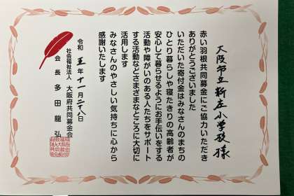代表委員会の子どもたちが、朝、校門に立って、募金の呼びかけをしました。その集まった金額を、共同募金に送ったところ、お礼の表彰状が届きました。集まった合計金額は、14,701円でした。