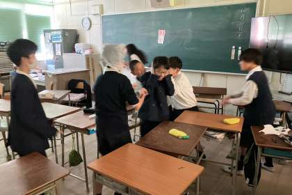 目を閉じてお化け屋敷に入って行きます。教室内は、この写真よりみるよりかなり暗い感じです。