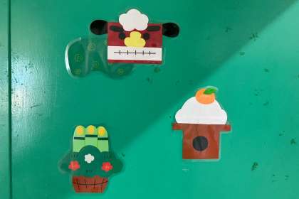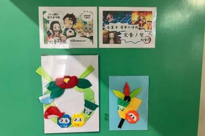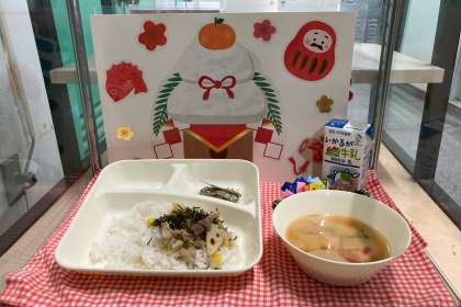 本日のメニューは、お雑煮がありました。給食調理員さんが、展示用のメニューと入口に飾り付けをしてくださって、お正月の雰囲気を醸し出してくださいました。