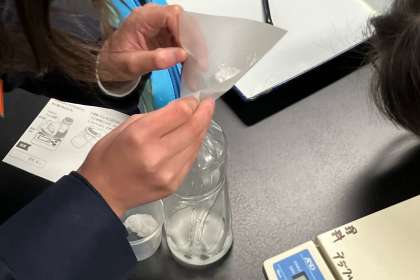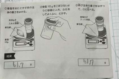水に溶けた物の重さはどうなるかを調べました。